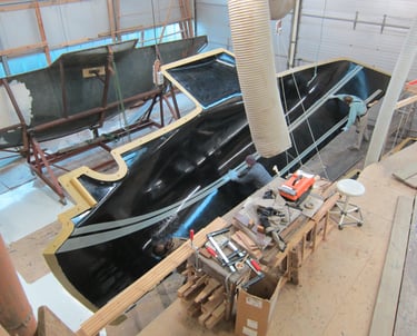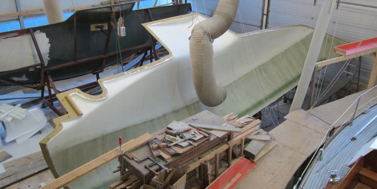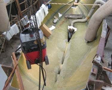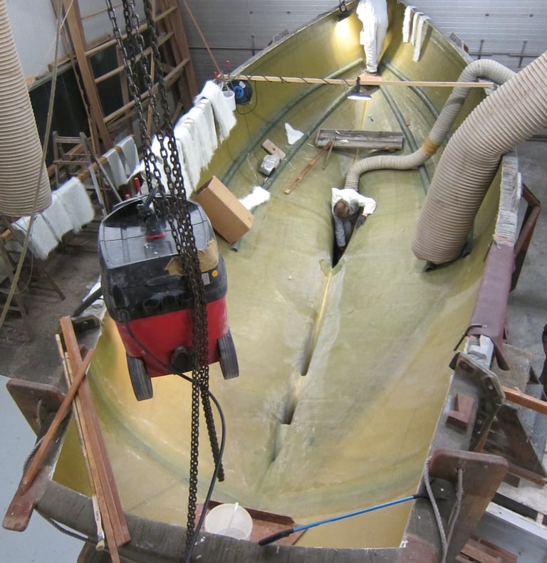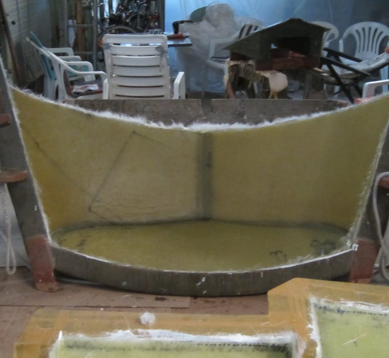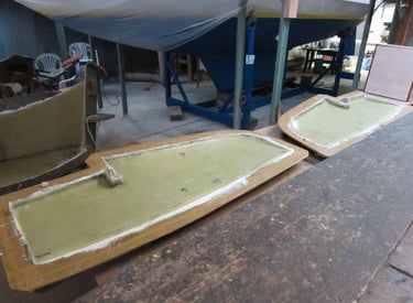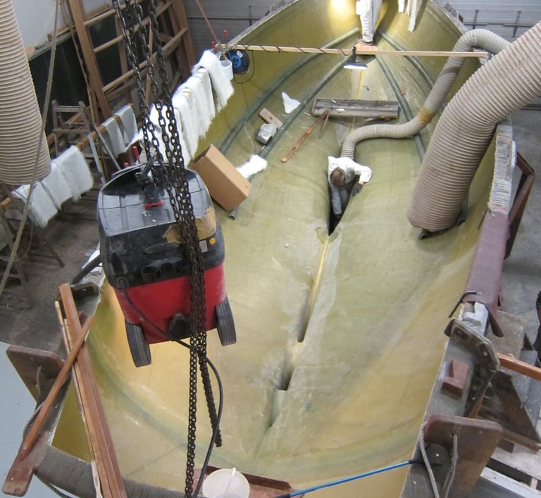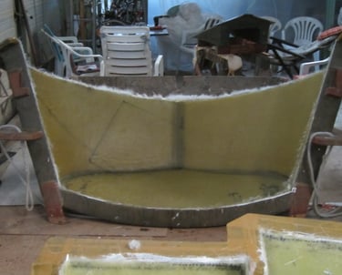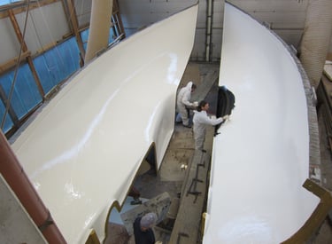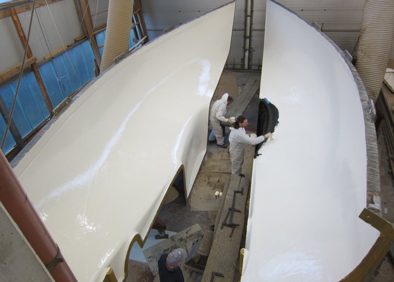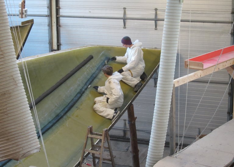 Zunächst wird die Form für den Rumpf vorbreitet. Die Schalen werden ordentlich gereinigt und kräftig poliert, damit anschliessend der GFK Rumpf laminiert werden kann. Der Rumpf ist letztlich auch das „Einzige“ was aus GFK hergestellt wird ...